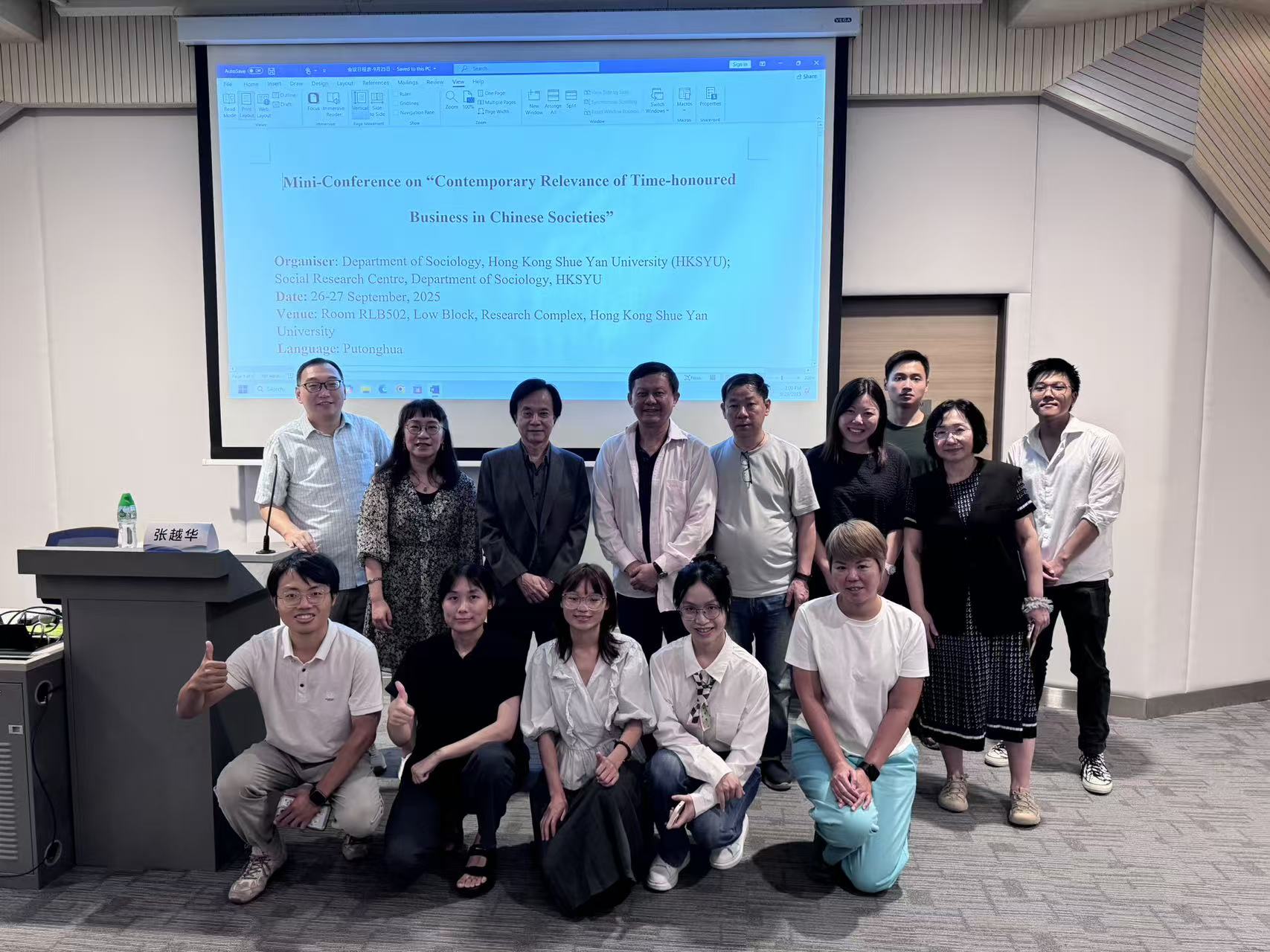 Department of Sociology and Social Research Centre worked together to organize a mini-conference entitled “Contemporary Relevance of Time-honoured Business in Chinese Societies” from 26 to 27 September, 2025 at HK Shue Yan University (HKSYU). This conference brings together nine scholars working on time-honoured businesses (laozihao, 老字號) from different prestigious research institutions, including Prof. ZHANG Jijiao (a leading researcher from Chinese Academy of Social Sciences, CASS and a member of the National Committee of the Chinese People’s Political Consultative Conference 全國政協委員), Prof. WEN Xueguo (an expert in law and business from Shanghai University), Prof. CHEN Jingwei (an expert in corporate finance from CASS), Dr. GAO Chong and Dr. Ni Na NG Camellia from HKSYU, two PhD candidates from University of CASS, one PhD candidates from Tsinghua University and one from Yunnan University. They investigate time-honoured businesses in Beijing, Hong Kong, Guangzhou, Yunnan, and other cities/provinces to examine the relational process and multiple ways of connecting laozihao businesses to contemporary socioeconomic conditions. In this regard, the new focus on contemporary relevance of laozihao helps to rethink it as a new case of business for good. In addition, the presenters will make efforts to publish a Special Issue with International Journal of Anthropology and Ethnology (Scopus indexed) in the near future.