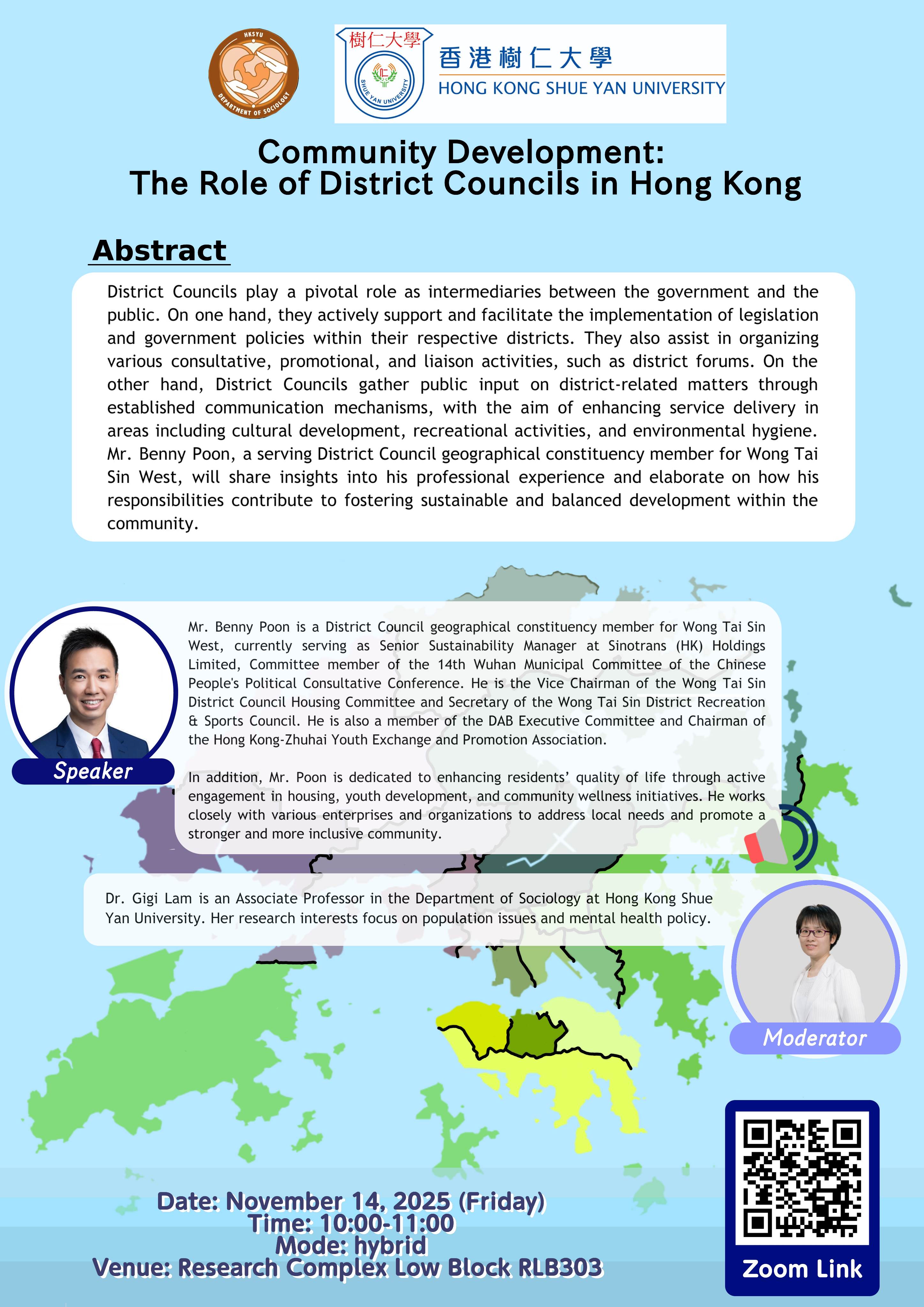 Join us for the Sociology Seminar entitled “Community Development: The Role of District Councils in Hong Kong” on 14 November 2025 (Friday). Details of the event are listed below.