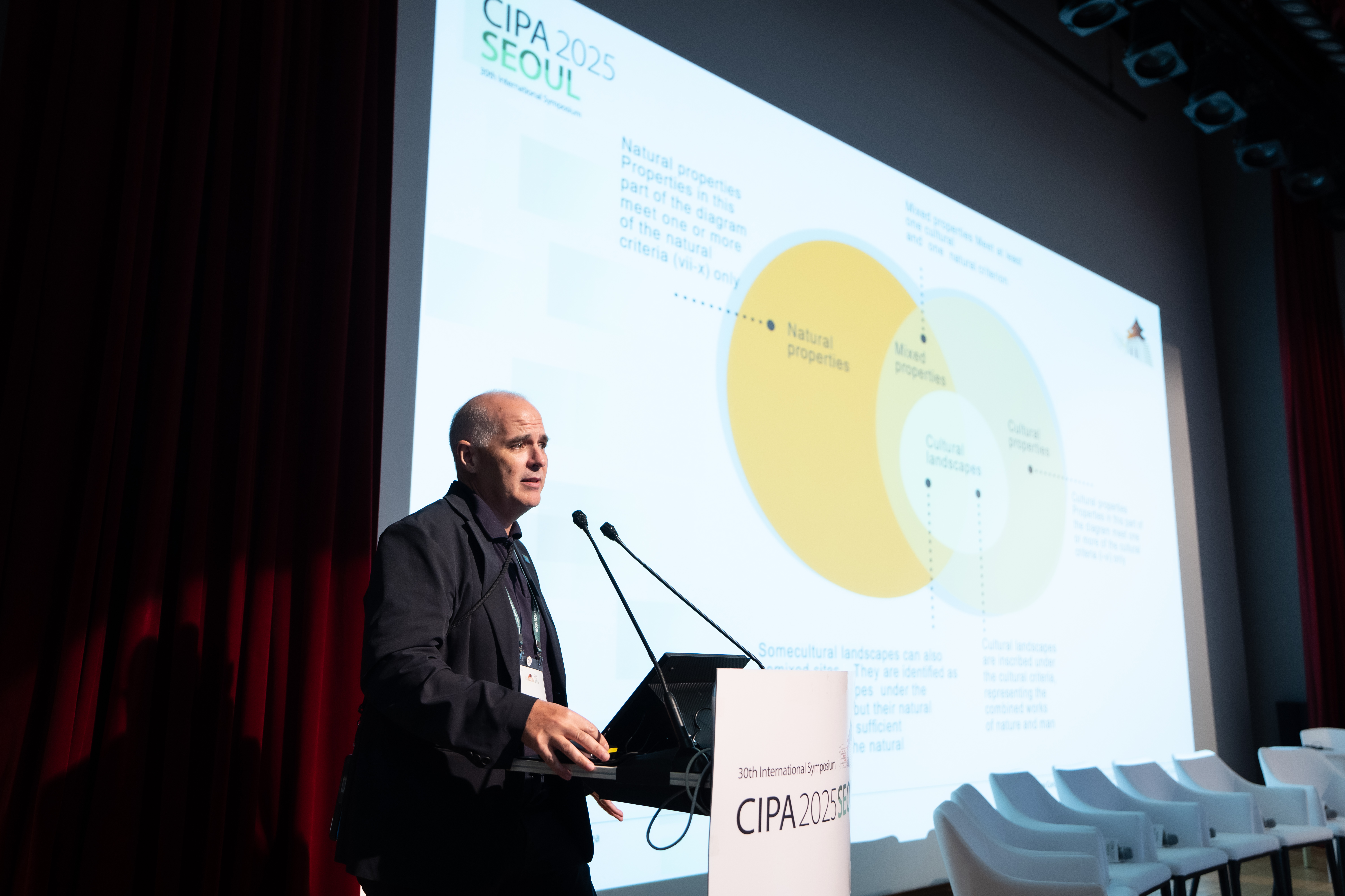Prof. Mario Santana Quintero, Co-Chair of the UNESCO Chair on Digital Twins for UNESCO World Heritage Conservation, speaking at the CIPA 2025 Seoul Special Session. ©CIPA 2025 Seoul
